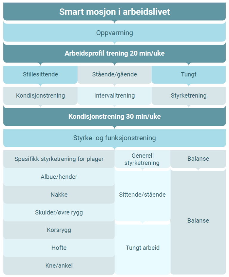 En som sitter hele dagen på kontor, trenger kanskje å bryte opp stillesittingen med mer aktive pauser og målrettet trening. En som legger tak eller har et annet fysisk krevende arbeid, trenger kanskje tid til å trene kondisjon og styrke for å forebygge skader.