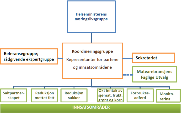 En referansegruppe bestående av ressurspersoner innen relevante innsatsområder som representerer seg selv og sin virksomhet, kan gi ekspertråd til koordineringsgruppen og innsatsområdene. Både ekspertise på ernæring, matteknologi og forbrukeratferd skal være representert i referansegruppen. Referansegruppen har ikke en fast sammensetning. Se mandat for referansegruppen, avtalens vedlegg 5 (PDF).
