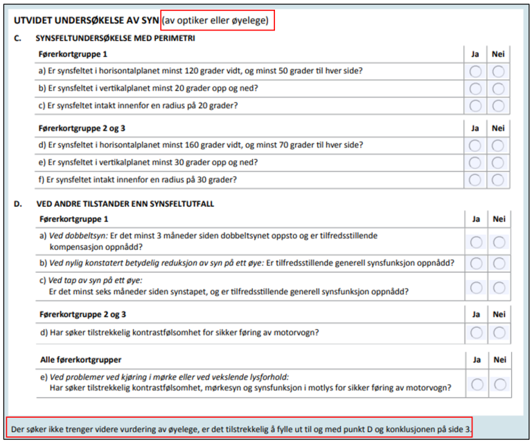 Ved behov for en utvidet undersøkelse av synet skal optiker eller øyelege fylle ut del C og de aktuelle spørsmålene i del D. Hvis det ikke er behov for videre vurdering av øyelege, er det tilstrekkelig å fylle ut til og med del D, og attestens konklusjon.