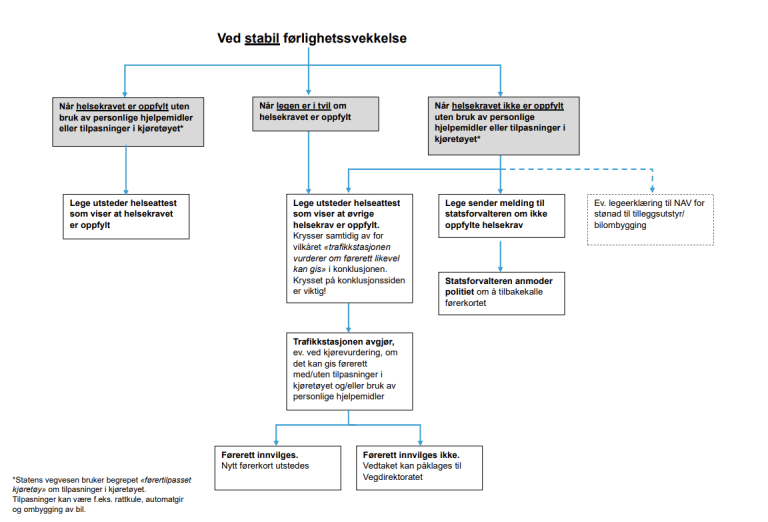 - Dersom tilstanden er stabil og førlighetskravet ikke er oppfylt, vurderer Statens vegvesen om det kan gis dispensasjon fra helsekravet, og om det skal settes vilkår om bruk av personlige hjelpemidler som protese/ortose og/eller førertilpasninger i kjøretøyet, inkludert automatgir. Legen utsteder helseattest som viser at øvrige helsekrav er oppfylt, og krysser av for vilkåret om at trafikkstasjonen (Statens vegvesen) vurderer om vedkommende kan få førerett. Legen må i tillegg sende melding til statsforvalteren (DOC) om at helsekravene ikke er oppfylt ved ny tilstand. Statens vegvesen kan ved stabil førlighetssvekkelse ikke utstede nytt førerkort med vilkår om bruk av personlige hjelpemidler, tilleggsutstyr eller annet, dersom tidligere førerett ikke er tilbakekalt. I tillegg må det eventuelt sendes legeerklæring til NAV med søknad om tilleggsutstyr eller ombygging av kjøretøy (nav.no).